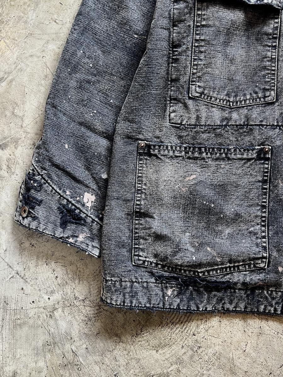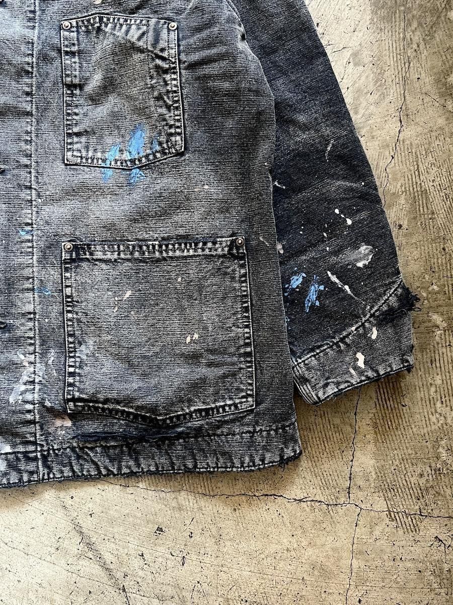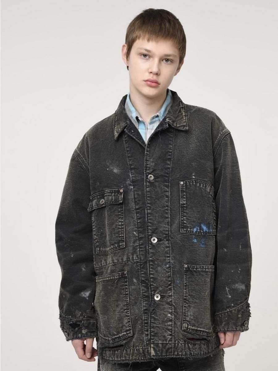 ペンキ跡や擦れ、味わい深い破れを加工で再現した。